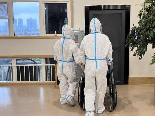 5、護(hù)士及醫(yī)生做好防護(hù)進(jìn)入發(fā)熱長者居室,幫助長者穿戴隔離衣并佩戴口罩,通過隔離轉(zhuǎn)運專用電梯,將發(fā)熱患者轉(zhuǎn)移至負(fù)壓救護(hù)車內(nèi);