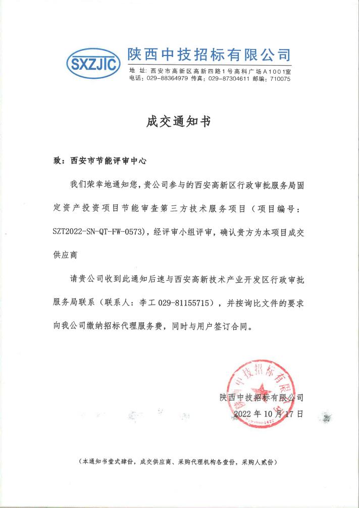 西安市節(jié)能評審中心在陜西省發(fā)展改革委投資咨詢評估“短名單”意向機構庫征集工作中成功入圍陜西省發(fā)改委機構庫,同時在西安市高新區(qū)行政審批服務局固定資產投資項目節(jié)能審查第三方技術服務征集活動中成為唯一指定第三方技術服務機構。